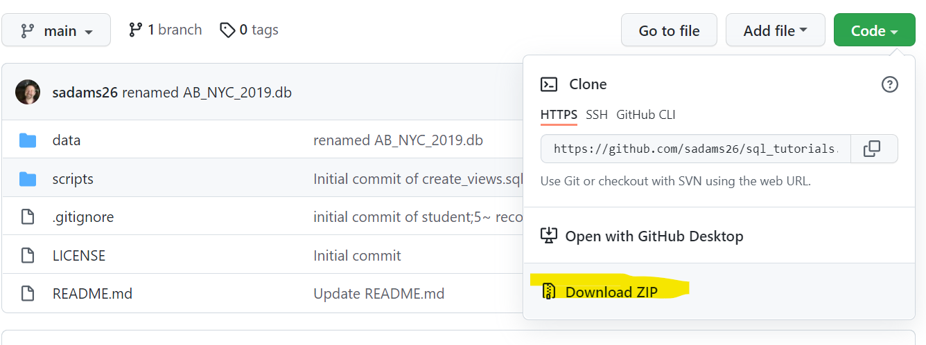 If you are unfamiliar with Git commands you can download the sql_tutorial repository as a zip file by clicking on the Code button on the sql_tutorial GitHub page. After downloading, be sure to extract the contents of the zip file to a desired location on your computer.
