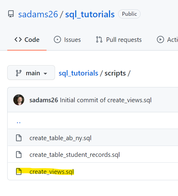 All materials can be found on GitHub in the sadams26/sql_tutorials repository. Specifically, the SQL code for this tutorial is stored in the create_views.sql file in the scripts directory.
